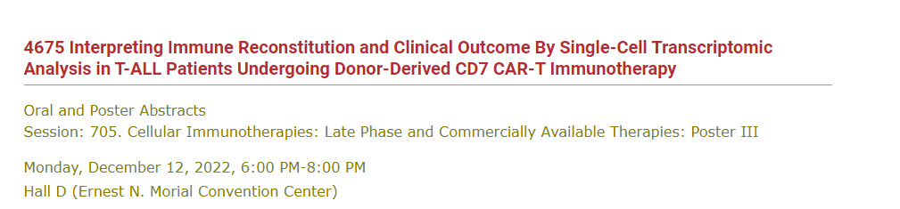 摘要名称:Efficacy and Safety of Donor-Derived CD7 CAR T Cells for r/r T-Cell Acute Lymphoblastic Leukemia/Lymphoma: Interim Analysis from a Phase 2 Trial
