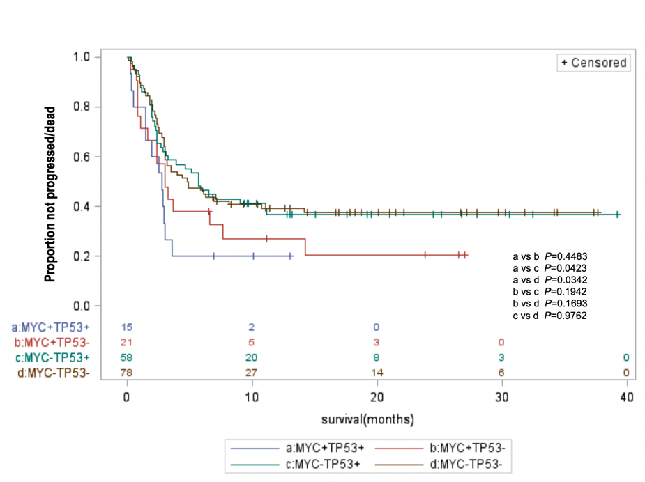根据MYC/TP53的检测结果,研究将172例DLBCL患者分为四组: