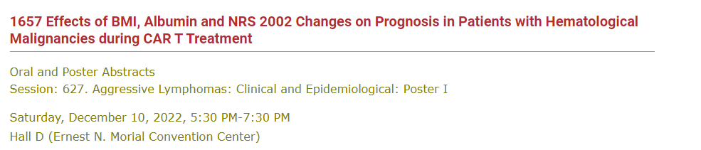2022年12月10日-13日,第64届美国血液学学会(ASH)年会将以线上线下相结合的形式召开。作为全球血液学领域规模最大的国际学术盛会,本次ASH大会上,高博医学(血液病)北京研究中心北京高博博仁医院克晓燕教授、胡凯主任团队张娜护士长特别报告了“Effects of BMI, Albumin and NRS 2002 Changes on Prognosis in Patients with Hematological Malignancies during CAR T Treatment”(血液系统恶性肿瘤患者BMI、白蛋白和NRS 2002营养状态评分对CAR-T治疗预后的影响),【摘要号1657】。